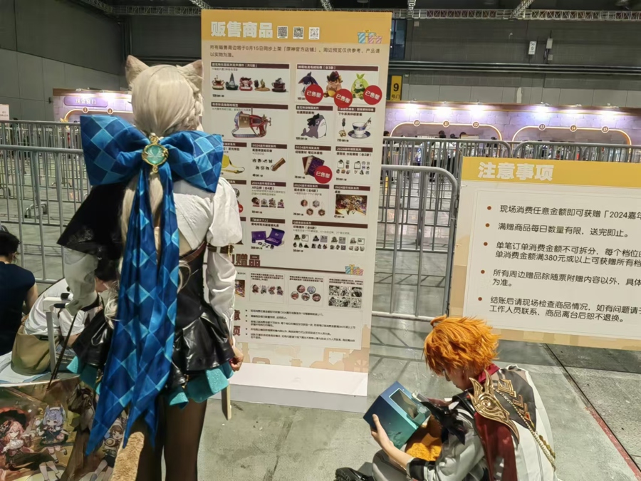 从北京来的“凌沿”是位准大学生,她COS成《原神》中流浪者来观展,也是《原神》中的人气角色之一。坐在地上休息时,一位观众上前送了她无料——一枚金色的摩拉。“凌沿”此前不玩游戏,有次被朋友拉着玩了《原神》,立刻被有趣的剧情和新奇的探索模式吸引了,也喜欢上了流浪者这个角色。“我是第一次来参加原神FES,也是第一次来上海。上海的二次元文化氛围比北京更浓厚,漫展做得也更好。除了原神FES,我还打算去打卡领结猫的主题餐厅。”