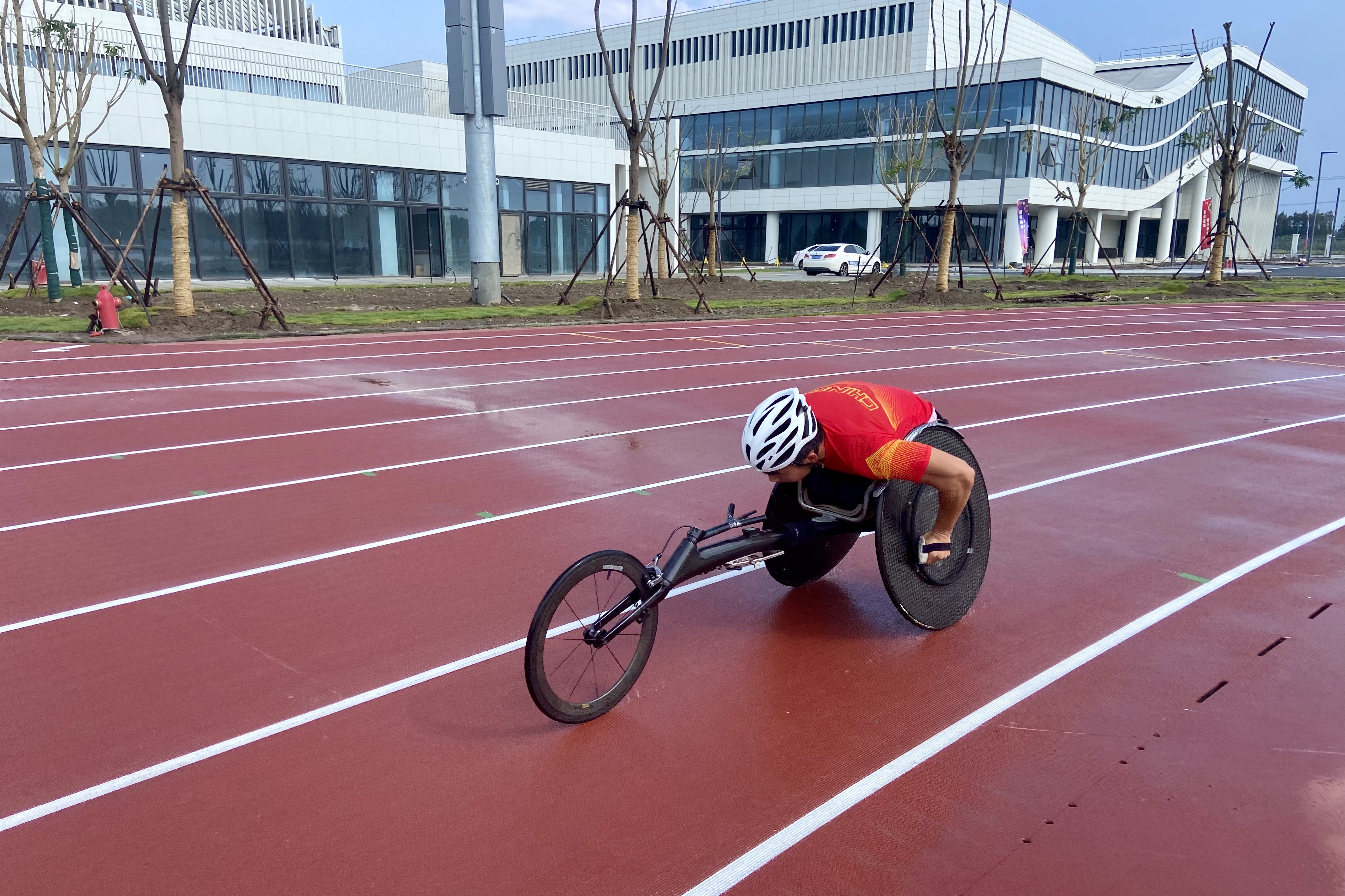轮椅竞速运动员在训练。