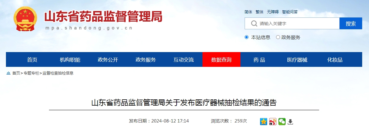山东省药品监督管理局关于发布医疗器械抽检结果的通告