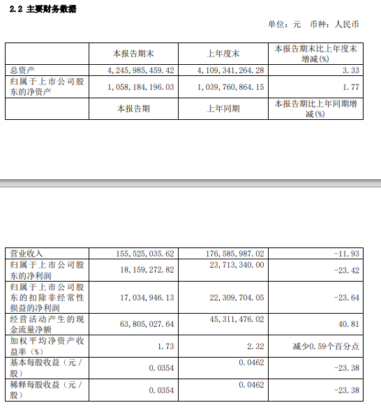 而在本报告期内营业收入为155,525,035.62元,归属于上市公司股东的净利润18,159,272.82元,分别较上年同期减少11.93%与23.42%。