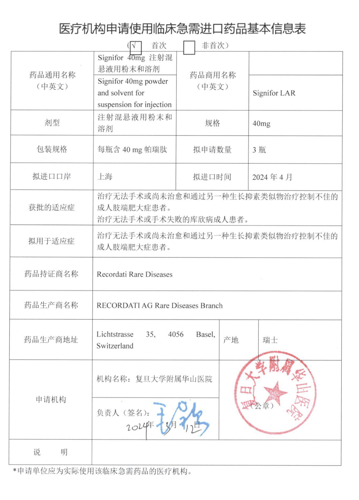 由于这是上海首次开展这项工作,上海市卫生健康委和上海市药品监督管理局相关部门主动对接华山医院进行指导。华山医院在主动接受这项“先行先试“任务后,成立了以赵重波副院长领导的工作小组,协调医务处、药剂科、“金垂体”多学科医疗团队,迅速制定临时进口药品管理制度、安全防范措施、风险处置预案,成立专家组,根据临床需求向国家药品监督管理局提出了申请。