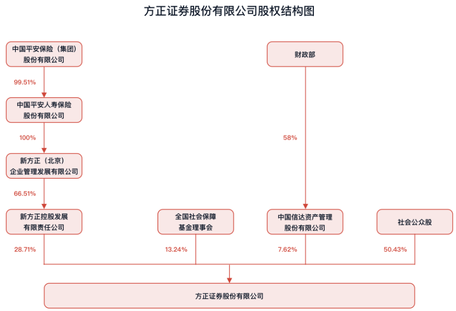 方正证券官网最新资料显示,新方正集团持股比例为28.71%,全国社会保障基金理事会持股比例为13.24%,中国信达持股比例为7.62%。