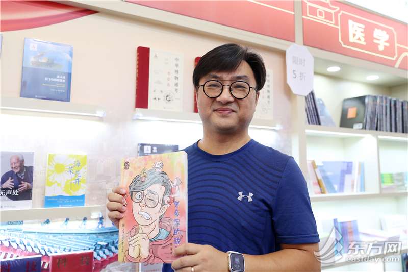 李钊轶正在给儿子挑选学习类工具书,今年他的身份既是逛展读者,也是签售作者。他的作品《老象家的故事》由上海交大出版社出版,也将在上海书展举办活动。“之前在家闲暇时画的,发布到网上后引起一定反响,就有出版社来找我。书里画了我们一家四口日常,有人说这是一部育儿漫画,我觉得更像漫画版肥皂剧”, 李钊轶在签售活动结束后,与家人们一起逛起了书展。