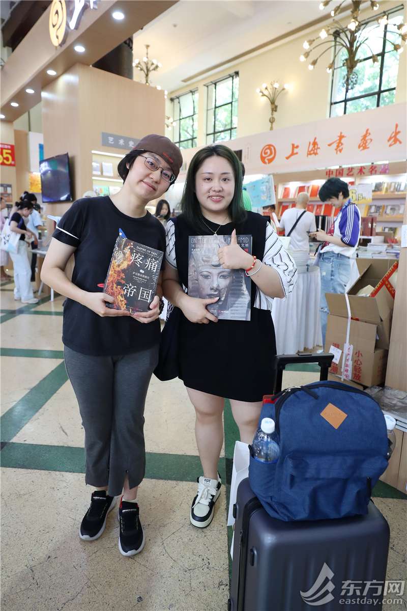 拖着箱子拎着袋子的小鱼和朋友正在翻阅上博古埃及文明大展图录,袋子里装着新买的《疼痛帝国:萨克勒家族秘史》,箱子里还有五六本书小说类。“我是来进货的,今天的目标是把行李箱装满!”,小鱼信心满满。