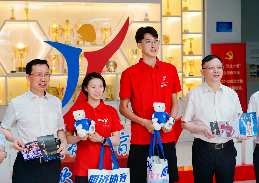 “感谢你们顽强拼搏,为国争光、为同济争光。”同济大学党委书记方守恩、校长郑庆华分别为两人佩戴同济大学校徽,勉励他们在继续确保完成训练任务的同时,加强文化知识的学习,提升综合素质。两位运动员则给学校带来了巴黎奥运会纪念徽章。