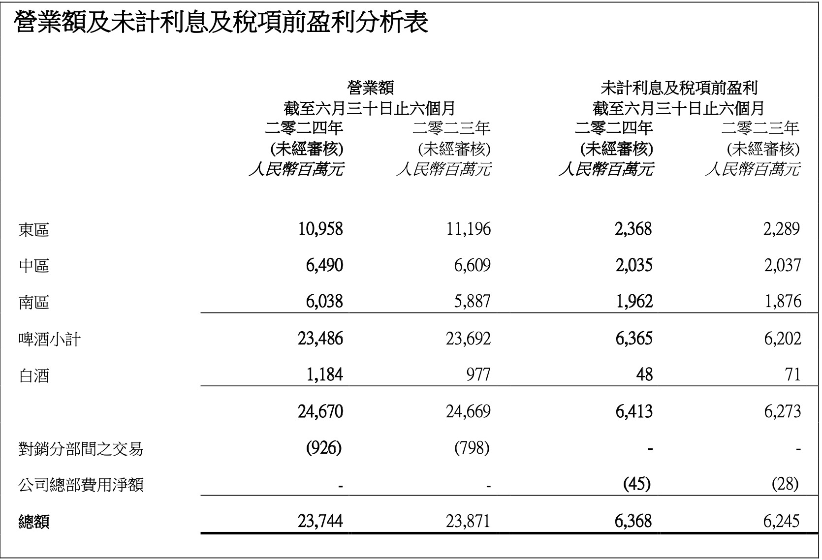 华润啤酒在财报中称,于回顾期内,消费者的消费模式分化,啤酒行业进入深度调整阶段,高端化趋势愈发明确。持续的高端化发展带动整体啤酒平均销售价格同比上升2.0%,同时部分包装物成本下降,使的啤酒业务在2024年毛利率上升0.6%至45.8%。另外,华润啤酒在控制经营费用,其在2024年上半年的啤酒业务经营费用同比基本持平。如果不计已确认推行产能优化所产生的相关固定资产减值亏损和一次性员工补偿及安置费用的影响,该公司未计利息及税项前盈利较疫情前的2019年上半年翻番,未计利息及税项前盈利率亦大幅提升至28.3%,创历史新高。