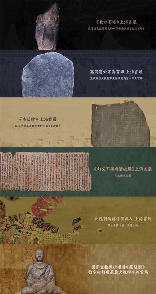 据了解,本次展览汇集敦煌研究院馆藏展品共计168件套,多件重量级国宝文物是首次亮相上海。其中,敦煌研究院馆藏文物中体积最大的《北凉石塔》,见证敦煌文化包容互鉴的莫高窟六字真言碑,证实记录莫高窟开凿时间的《圣历碑》,入选国家宝藏的《归义军衙府酒破历》,禁止出国(境)展览文物北魏刺绣佛像供养人,均为上海首展。还有国家文物保护项目《藏经洞》数字回归成果最大规模全球首展。