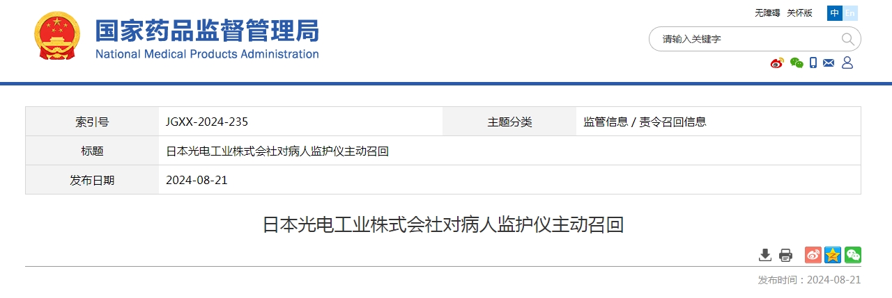日本光电工业株式会社对病人监护仪主动召回