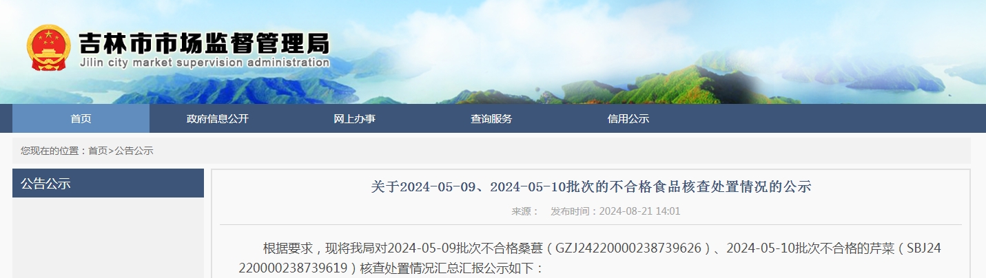 吉林省吉林市市场监督管理局关于2024-05-09、2024-05-10批次的不合格食品核查处置情况的公示