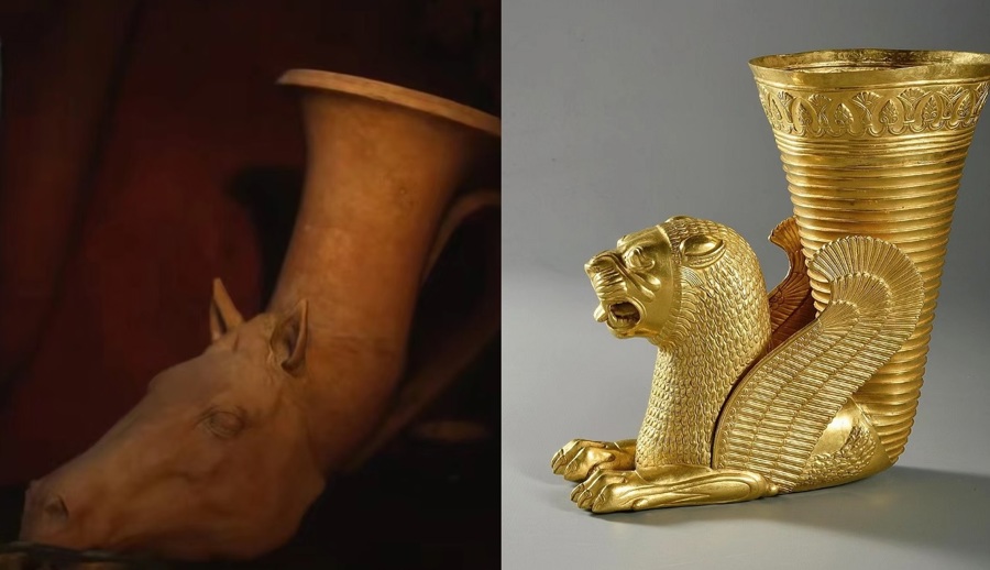 而另一件法宝“羔儿酿”,外形是一只栩栩如生的马首后连接着带把手的高杯。不少网友纷纷晒图,这件用以恢复体力的法宝与文物“来通杯”外形十分相似。在上海博物馆举行的“古波斯的荣耀:伊朗文物精华展”上,就展出多件不同造型、不同材质的来通杯,其中一件金色的有翼狮金来通,前端是狮子,后方是杯子。异曲同工的还有陕西历史博物馆的镇馆之宝之一镶金兽首玛瑙杯,也被认为是来通的一种。上海博物馆青铜研究部研究馆员王樾介绍,来通杯(Rhyton)是流行于亚欧大陆上的古老饮酒器,被认为可能源于人类最早用动物角制杯饮酒的习惯,公元前2000年开始就已出现,并逐渐流行于从爱琴海到西亚的广阔区域并传入中国,也发展出不同制作材料和更精致的造型。镶金兽首玛瑙杯是唐代时期文物,出土于陕西省西安市南郊何家村,时代背景与《西游记》一致。