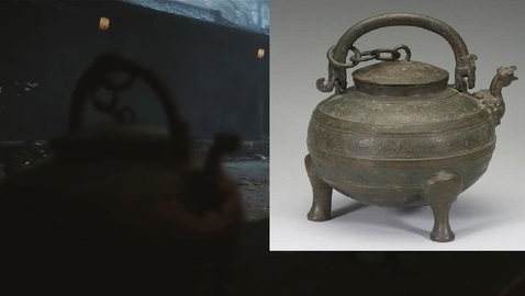 就连游戏画面和过场动画一闪而过的画面中,也藏着不少文物的身影。在主角穿梭于蜘蛛精居住的庭院中时,一对青铜灯一闪而过,这样的灯能在汉代铜灯中找到不少“同款”。这些灯在灯柱上分层伸出多枚灯盏,整体犹如一棵树,因而一般被称为连枝灯。而庭院中为“排宴”摆放的案几上,放着一尊带提梁的圆形青铜器,腹部浑圆,顶部有盖,带多个环套链接成的提梁,嘴部似鸟,而三足则是兽足。这一形象与上海博物馆所藏战国晚期的春成侯盉十分相似,是东周时期装酒或水的容器。
