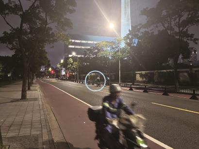 在苗江路,尽管装了机动车和非机动车车道的隔离栏,公路自行车骑行者占用机动车道骑行的情况仍时有发生。圈中骑行者即为占用机动车道。邬林桦 摄