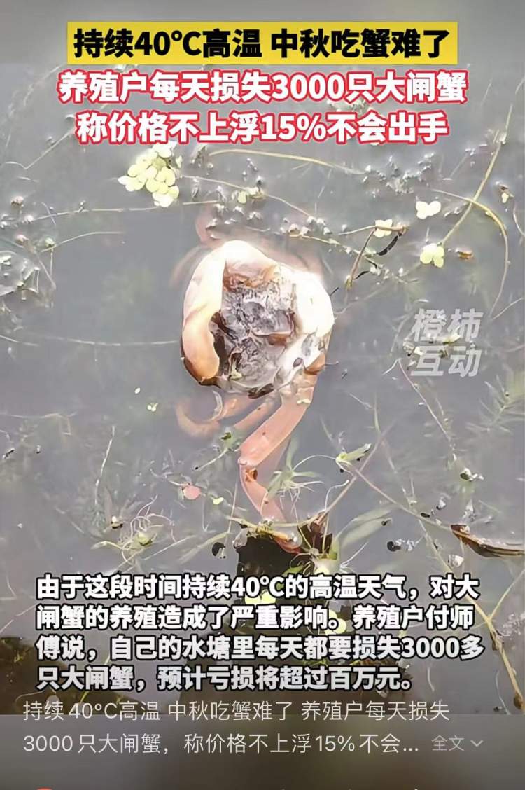 因为持续高温导致大闸蟹死亡率超过正常水平,外地有养殖户称:今年损失上百万,所以价格不上浮15%不出手。不少市民看了报道后纷纷认为,看来今年大闸蟹要涨价。