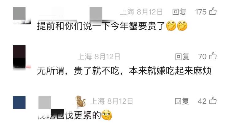 听闻今年持续高温对大闸蟹生长产生影响后,还有一些市民表示,“看来今年中秋节是吃不到大闸蟹了。”