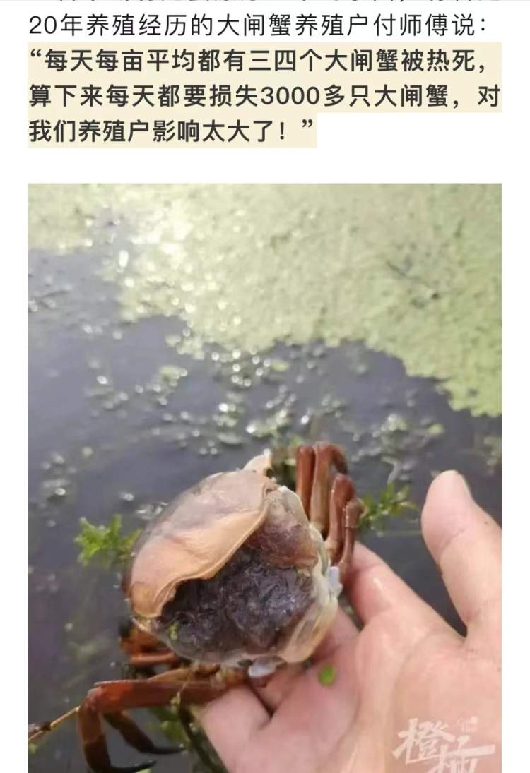 据了解,高温会让大闸蟹的胃口变差,生长速度减缓、蜕壳延迟。