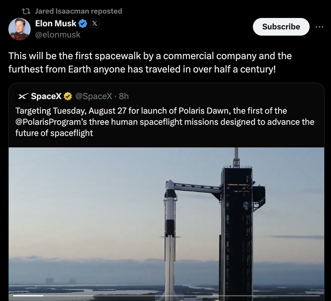 8月22日,SpaceX及特斯拉CEO埃隆·马斯克在社交媒体X上表示,“这将是商业公司首次进行太空行走,也是半个多世纪以来人类距离地球最远的太空行走!”