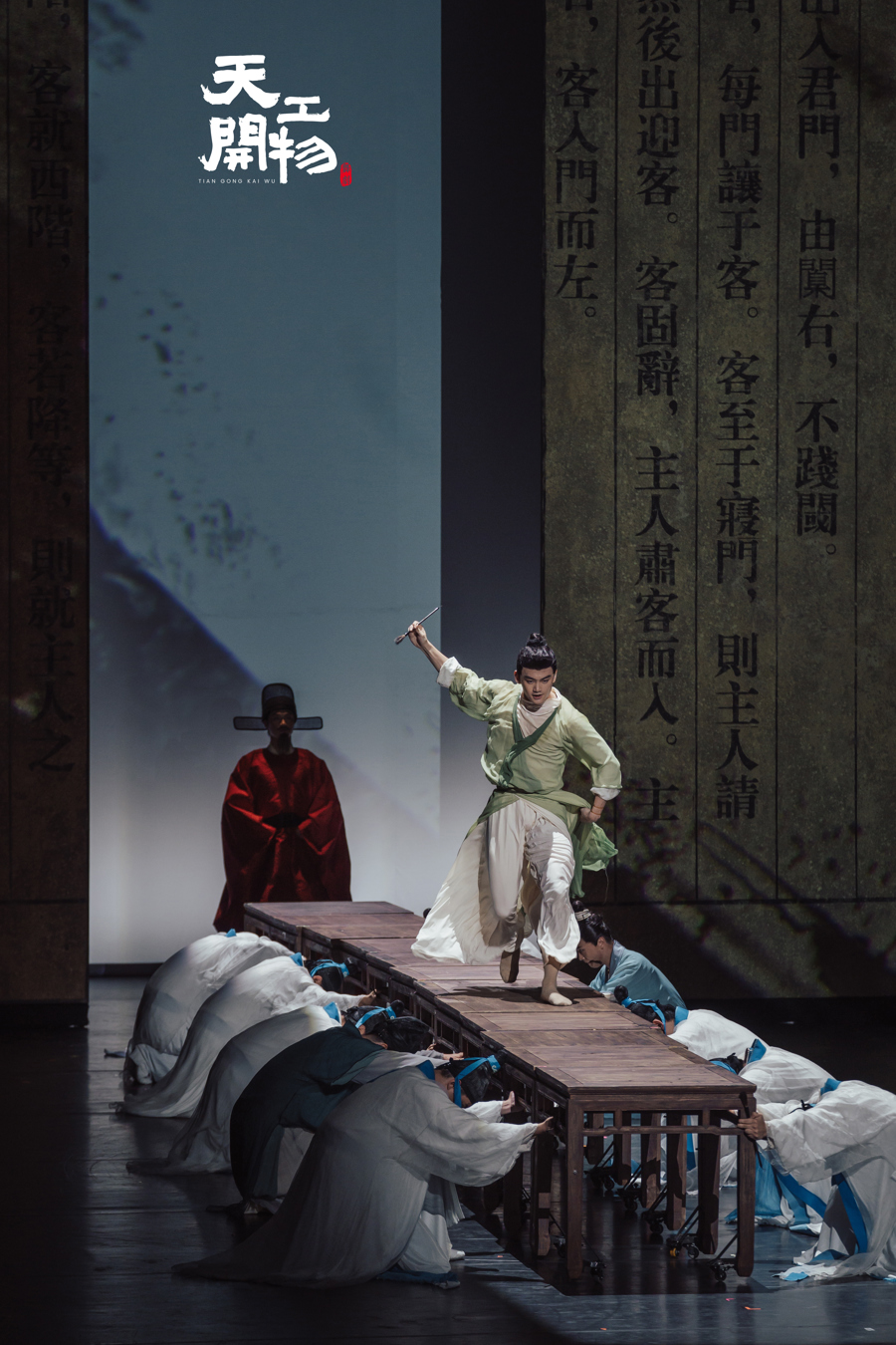 青年宋应星扮演者吕科镝,舞蹈刚劲有力又极具柔韧性。老年宋应星的扮演者马蛟龙曾荣获荷花奖金奖。陆川希望通过舞台之美、服章之美、音乐之美、影像之美、装置之美、工匠之美、科技之美、大地之美定义“明制美学”。原书中123幅白描绣像的插图成为贯穿全局的美学元素。