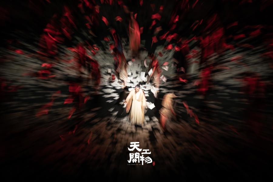 舞剧《天工开物》以赶考、著书、山河等为线索,通过舞蹈、影像和现代科技结合展现宋应星科考六次落榜后,潜心研究中国古代科技工艺的经历。作为电影导演,陆川在《天工开物》中运用别出心裁灯光和色调。中场过后,色调由明转暗,六次落榜如梦魇般缠绕。舞台前后双层纱幕,象征着宋应星逆行世间的空间,将舞台的实景与电影的虚幻和代入感融为一体。“错落有致的书页”不断推移、旋转、组合,带来一个超现实的舞台空间。