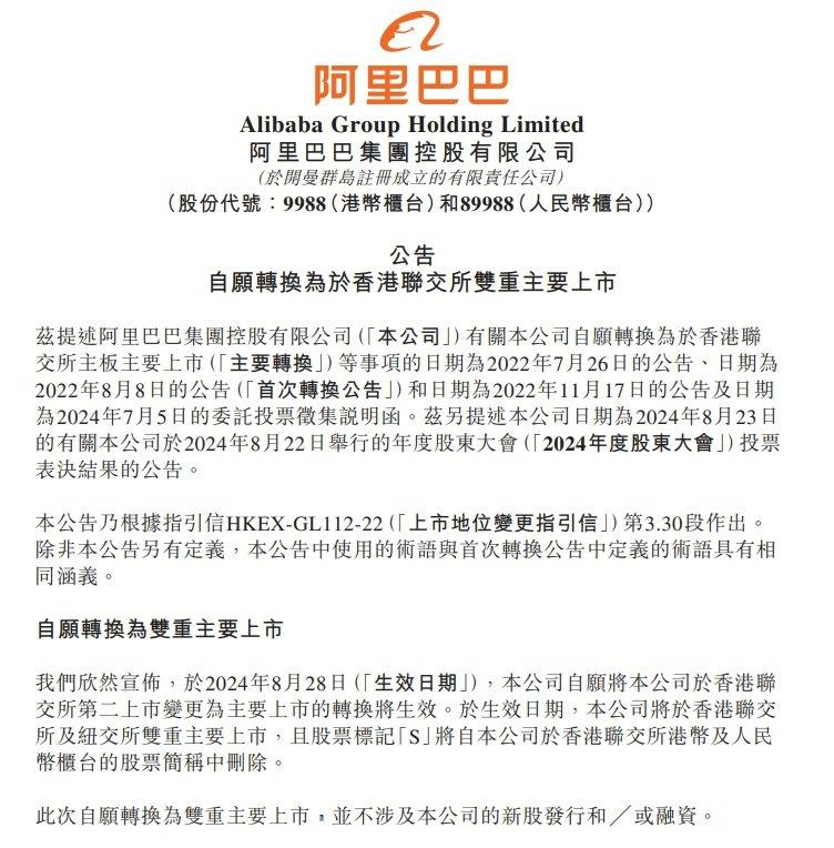 阿里巴巴在公告中表示,于2024年8月28日,公司自愿将本公司于香港联交所第二上市变更为主要上市的转换将生效。于生效日期,本公司将于香港联交所及纽交所双重主要上市,且股票标记将自本公司于香港联交所港币及人民币柜台的股票简称中删除。此次自愿转换为双重主要上市,并不涉及本公司的新股发行和融资。