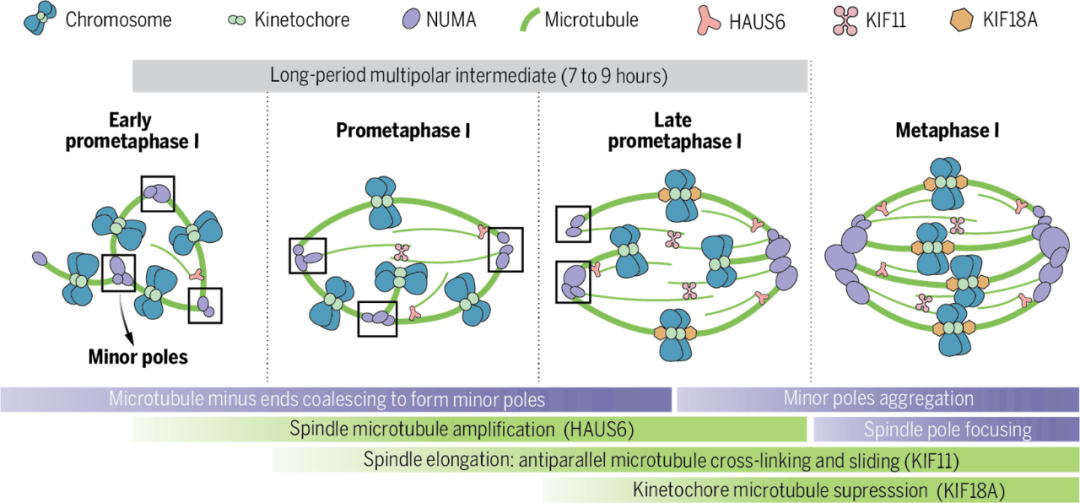 在最新研究中,团队通过免疫荧光和活细胞时间序列成像技术,首次对减数分裂开始后纺锤体的组装过程进行了高清晰度的实时观察。结果显示,人卵母细胞核膜破裂之后,染色体动粒会相聚成簇。随后,新生微管负端在动粒附近聚合并初步形成纺锤体的极,将其命名为“小极(Minor pole)”。