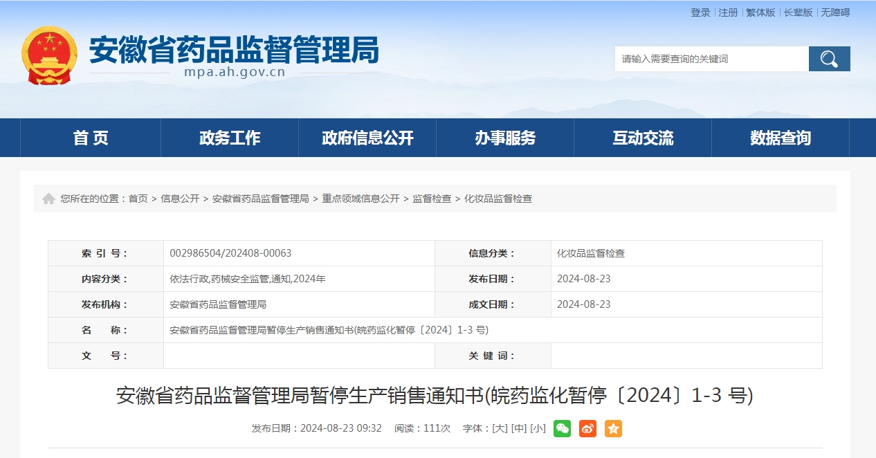 安徽省药品监督管理局暂停生产销售通知书(皖药监化暂停〔2024〕1-3 号)