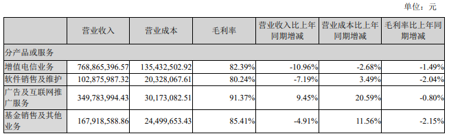 增值电信业务、软件销售及维护、基金销售及其他业务的营业收入,上半年分别实现7.69亿元、1.03亿元、1.68亿元,同比分别减少了10.96%、7.19%、4.91%。