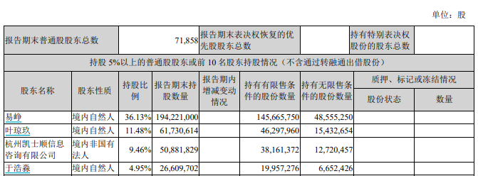 截至报告期末,易峥为第一大股东,持股比例为36.13%;叶琼玖紧随其后,持股比例为11.48%;杭州凯士顺信息咨询有限公司持股比例为9.46%。
