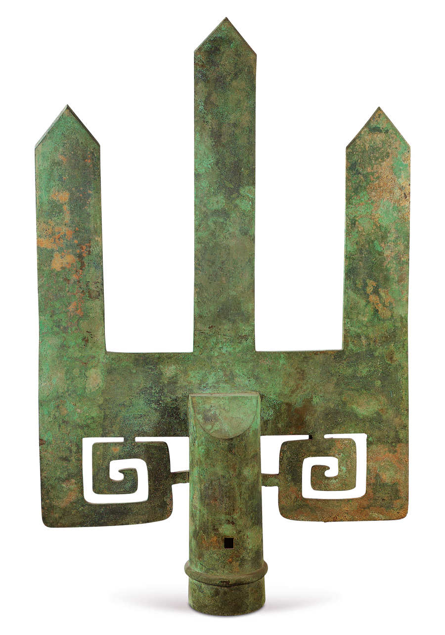 展厅到处可见铜山字形器的元素。据考证,铜山字形器为古中山国的仪仗礼器。中山成公墓出土的铜山字形器一套6件,高143厘米;中山王厝墓出土的铜山字形器一套5件,高119厘米。器物上部呈“山”字形,形体高大,气势威严;器物下部中间有安插木柱的圆筒状孔,出土时孔内留有朽木。由此可见,铜山字形器是插在木柱上竖立排列的,象征着古中山王的权威,也是战国时代中山国特有的青铜器。
