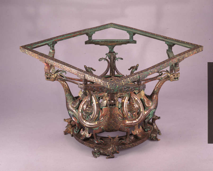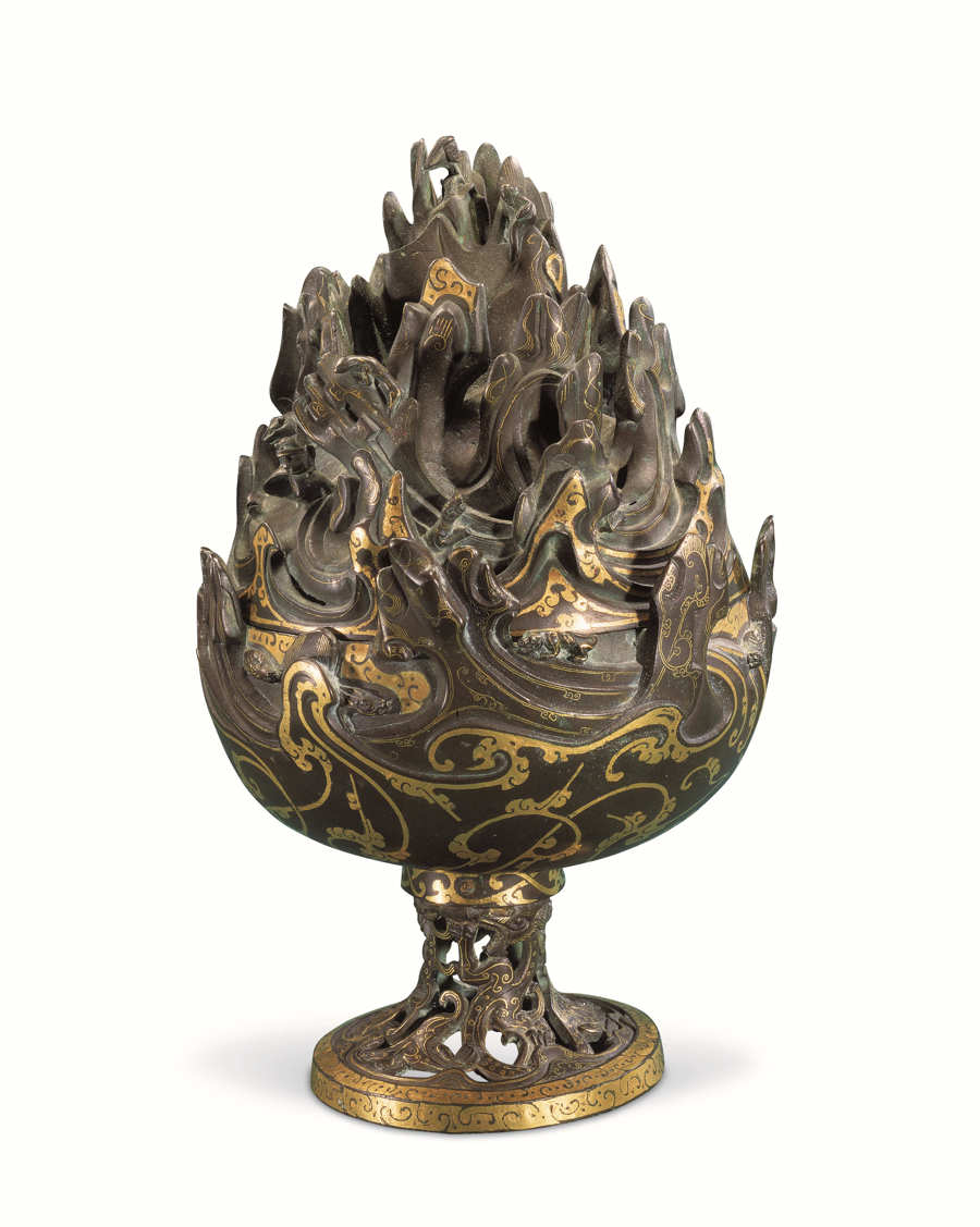 错金银工艺也是中国古代一项金属装饰技法,春秋中晚期兴盛起来,汉代最为盛行,主要分镶嵌法和涂画法两种。刘胜墓出土的错金博山炉整体铸造了高低起伏的山峦,并因山势镂孔,雕塑出神兽、虎豹、小猴、持弓猎人等,炉柄则雕成三龙出水,使用时香料的烟雾可从镂孔中缓缓飘出,工艺精湛,装饰华美,是当时的能工巧匠对山水、风物、人文、科学的精美表达。