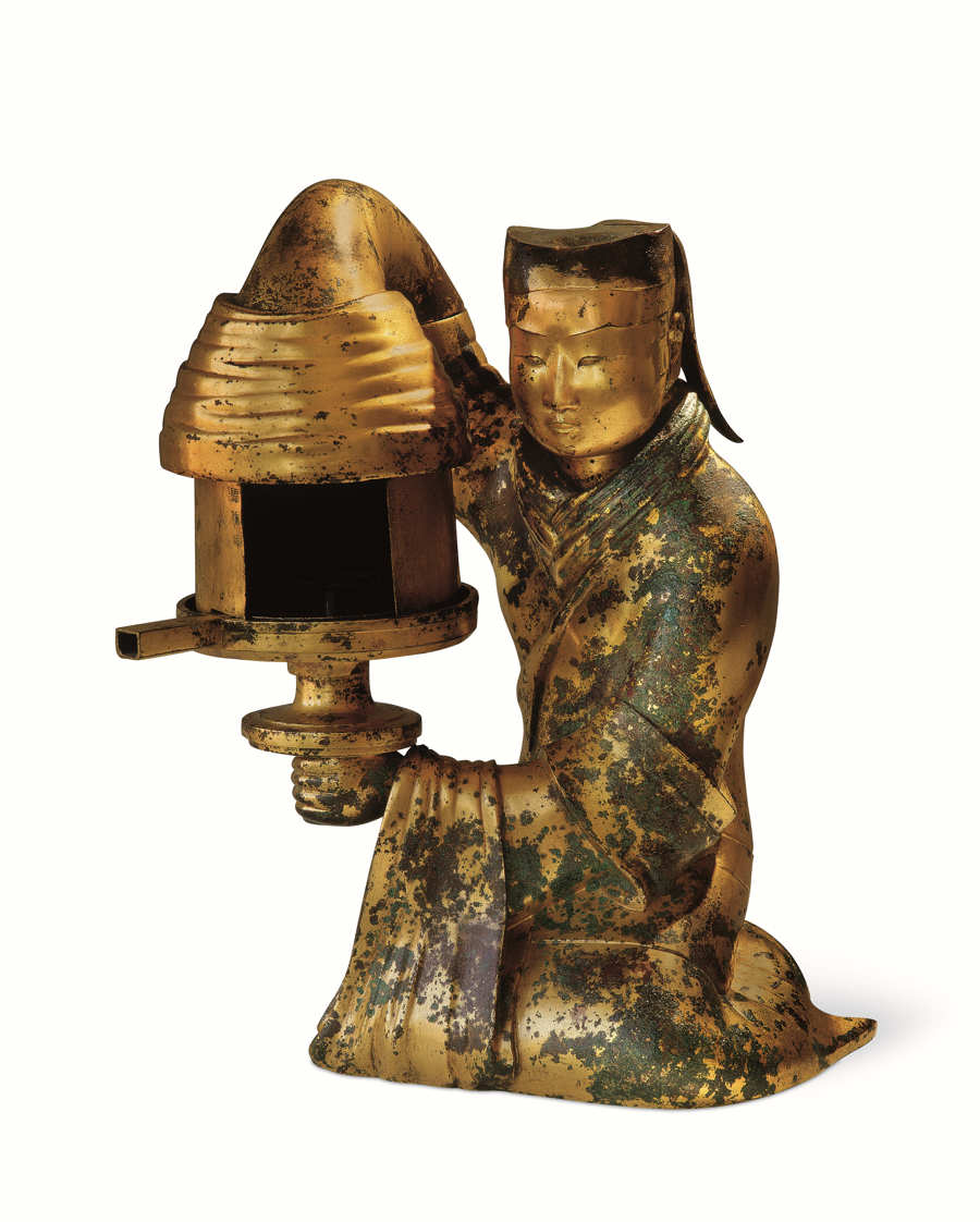 鎏金,是中国一门古老的传统装饰工艺。最早的鎏金实物出现在战国时期,到汉代趋于鼎盛。眼前的“中华第一灯”长信宫灯便采用了鎏金技法。长信宫灯出土于窦绾墓中,其形为跪地执灯的年轻宫女,全灯分头、身、臂、灯座、灯盘、灯罩等部分,灯盘的屏板可推动开合,以调节灯光亮度和照射方向。宫女身体中空,灯芯燃烧后产生的烟灰经右臂进入体内。灯上刻有“阳信家”“长信尚浴”等铭文9处,共65字。根据铭文研究,可知此灯的主人原是阳信夷侯刘揭,因其子犯事,灯被没收,归皇太后居住的长信宫所有。文帝的皇后窦氏是刘胜的祖母,景帝时为皇太后,窦太后把此灯送给她娘家族裔中的窦绾,窦绾死后将灯葬入墓中,可谓流转有序,是价值连城的国宝级文物。