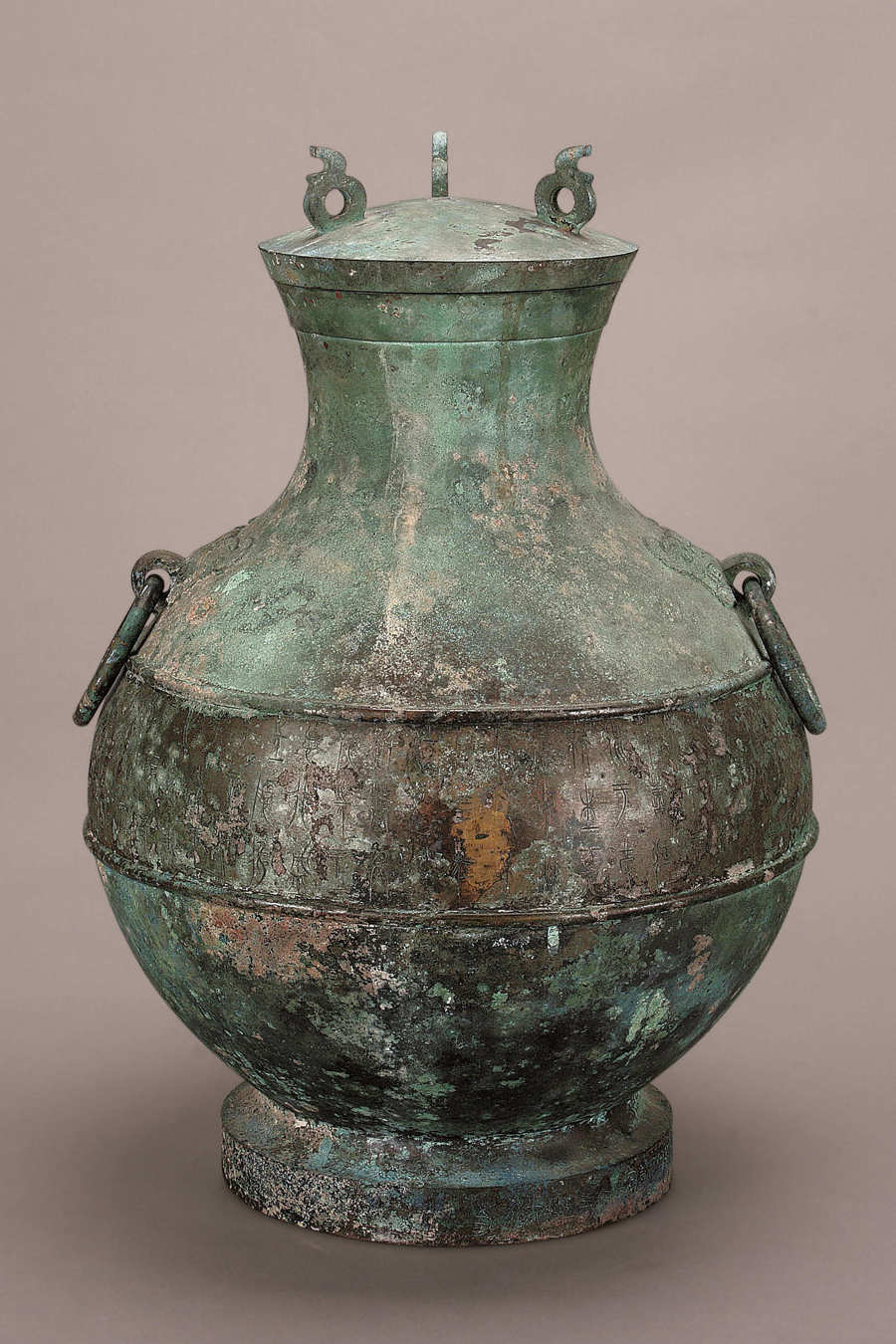同在刘胜墓出土的错金银鸟篆文铜壶周身用纤细的金、银丝镶嵌出鸟篆文字和动物纹带。鸟篆文是篆书的变体,以鸟虫之形组字,似书似画,灵动绚丽。壶盖有文字12字,壶身有文字32字。壶身文字大意是,这是个尊贵完美的壶,无论盛水还是盛酒,都是一种心情上的享受。饮酒不仅可以享受飘飘欲仙的感觉,而且还能疏通血脉,滋润肌肤,使人延年祛病,长命百岁。不凡之物,却有着深情的蕴涵。