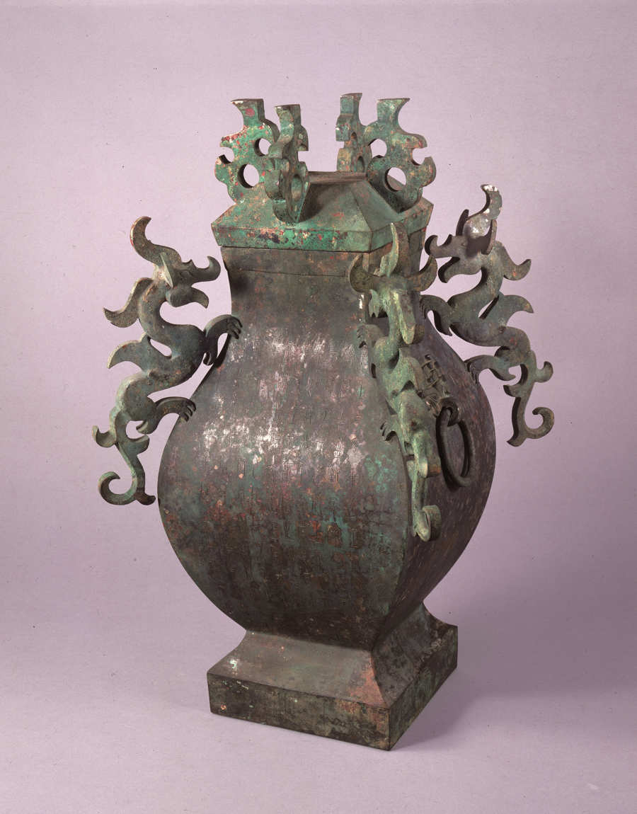 中山王厝铜方壶同属古中山国的酒器和礼器,造型简练,棱角分明,壶盖上有四个镂空云形钮,壶腹两侧各有一个兽面衔环铺首,壶身四角各铸一条神采飞扬的蛟龙,四周刻有铭文450字,堪称一件优秀的战国书法作品。该铭文记载:中山王厝十四年,中山伐燕获胜后用燕国的青铜器熔铸此壶。铭文颂扬了中山国伐燕的战绩,其中提到的“皇祖文武,桓祖成考”等中山国国君名号,填补了史籍中关于中山国君王世系记录的缺漏。它与铁足铜鼎目前都是国宝级的青铜重器。