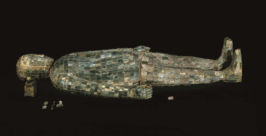 我们在堪称重量级国宝的金缕玉衣前长久驻足。这是我国出土年代最早的完整玉衣。刘胜玉衣长1.88米,按人体结构比例制作,分头罩、上衣、手套、裤筒和鞋等部分。全套玉衣由各种形状的玉片组成,玉片四角有孔,用金丝加以编缀,共用玉片2498片,金丝1100克。同时出土的还有镶玉鎏金铜枕、玉眼盖、玉鼻塞、玉耳塞等,从而组成一套完整的葬玉。窦绾墓中也出土了一套女式金缕玉衣。两套金缕玉衣出土时均完好无损,但尸身已严重腐朽,仅有部分牙齿珐琅质碎渣和人骨渣残存。