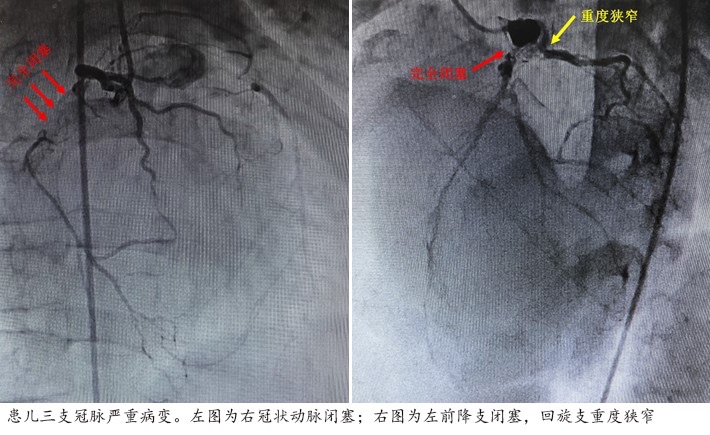 东方网记者刘轶琳8月23日报道:近日,国家儿童医学中心复旦大学附属儿科医院成功完成国内首例川崎病合并冠状动脉病变患儿冠状动脉搭桥术后吻合口再狭窄支架植入术,患儿术后恢复良好。 小伦自2岁起便与川崎病及其引发的严重冠状动脉病变相伴,几经生死考验。2021年,在复旦儿科,心内科刘芳教授团队进行了细致的评估和冠状动脉造影手术,揭示了令人心惊的现实——左冠状动脉前降支和右冠状动脉完全闭塞,仅存的回旋支也存在狭窄病变(见下图),小伦的生命仿佛悬于一线。