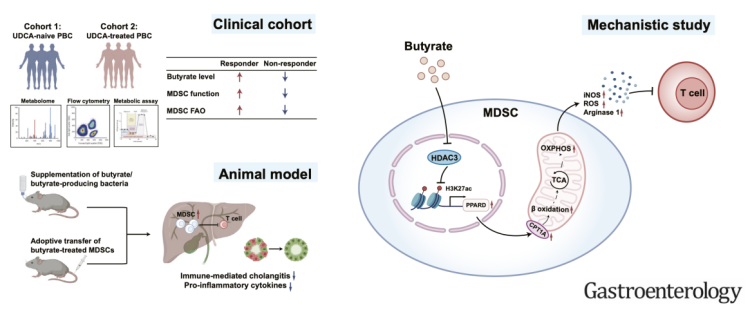 近日,消化领域顶级期刊《胃肠病学》(IF=25.7)以封面文章的形式发表了上海交通大学医学院附属仁济医院马雄教授课题组最新研究成果。这项研究揭示了肠菌代谢物丁酸通过调控髓源性抑制细胞功能来缓解原发性胆汁性胆管炎的机制,为疾病治疗提供新思路。