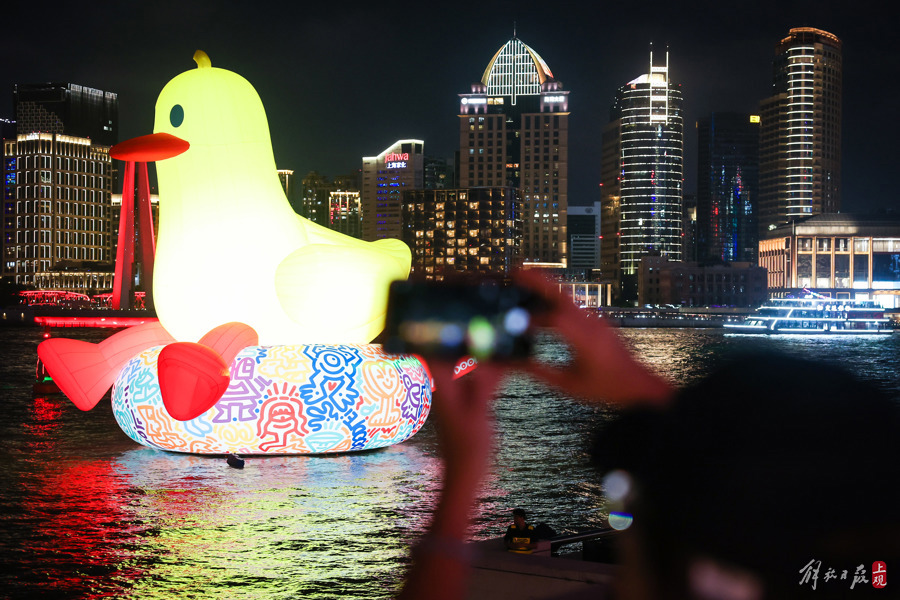 高达20米的巨型艺术装置“鸭马路”亮相黄浦江,吸引了众多关注。