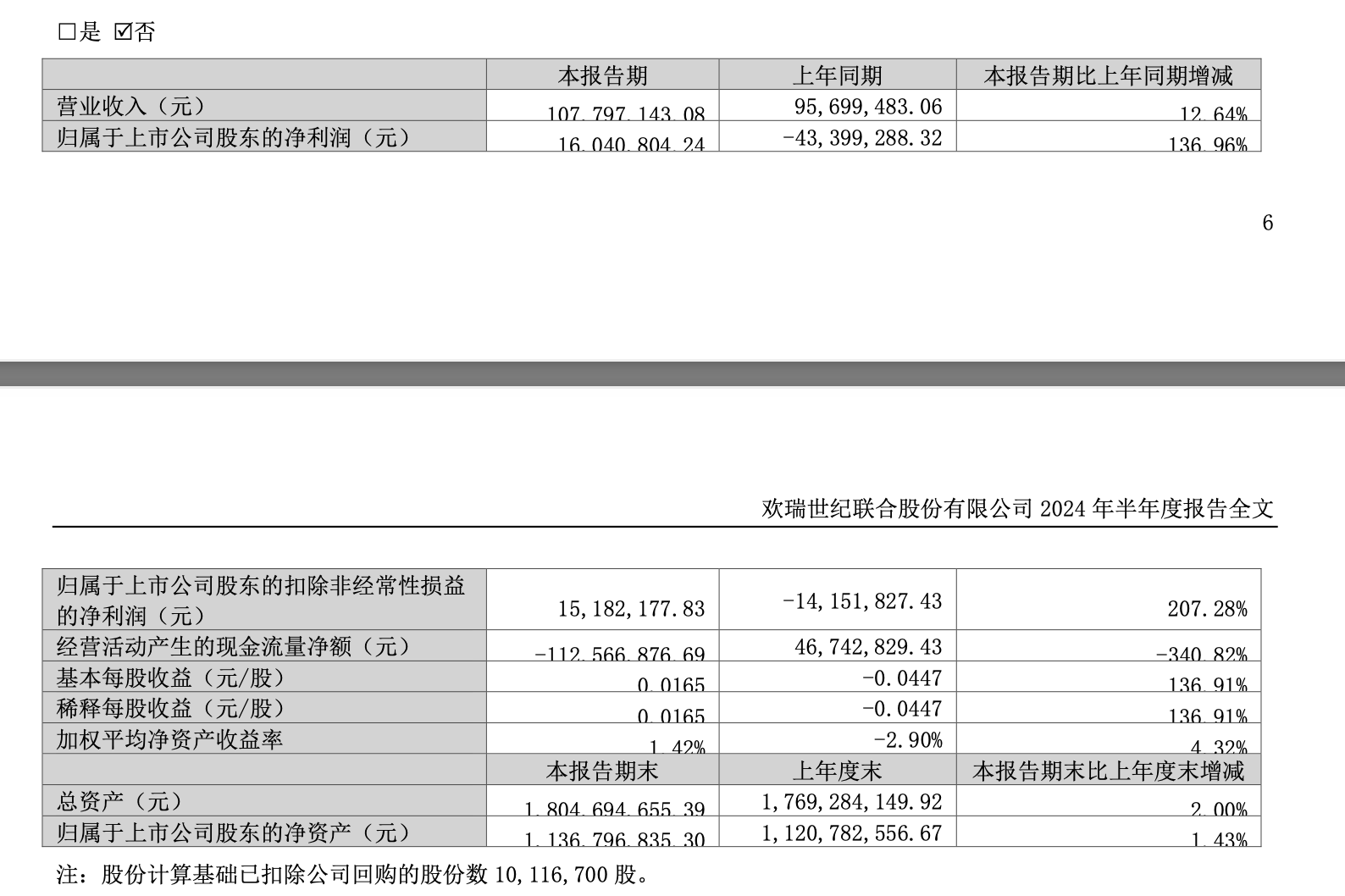 8月25日,欢瑞世纪联合股份有限公司(欢瑞世纪,000892.SZ)发布2024年半年度报告,上半年营收约1.08亿元,比上年同期增长12.64%,主要系本报告期内艺人服务增加所致;归属于上市公司股东的净利润为1604万元,同比增长136.96%,扭亏为盈。基本每股收益0.0165元。