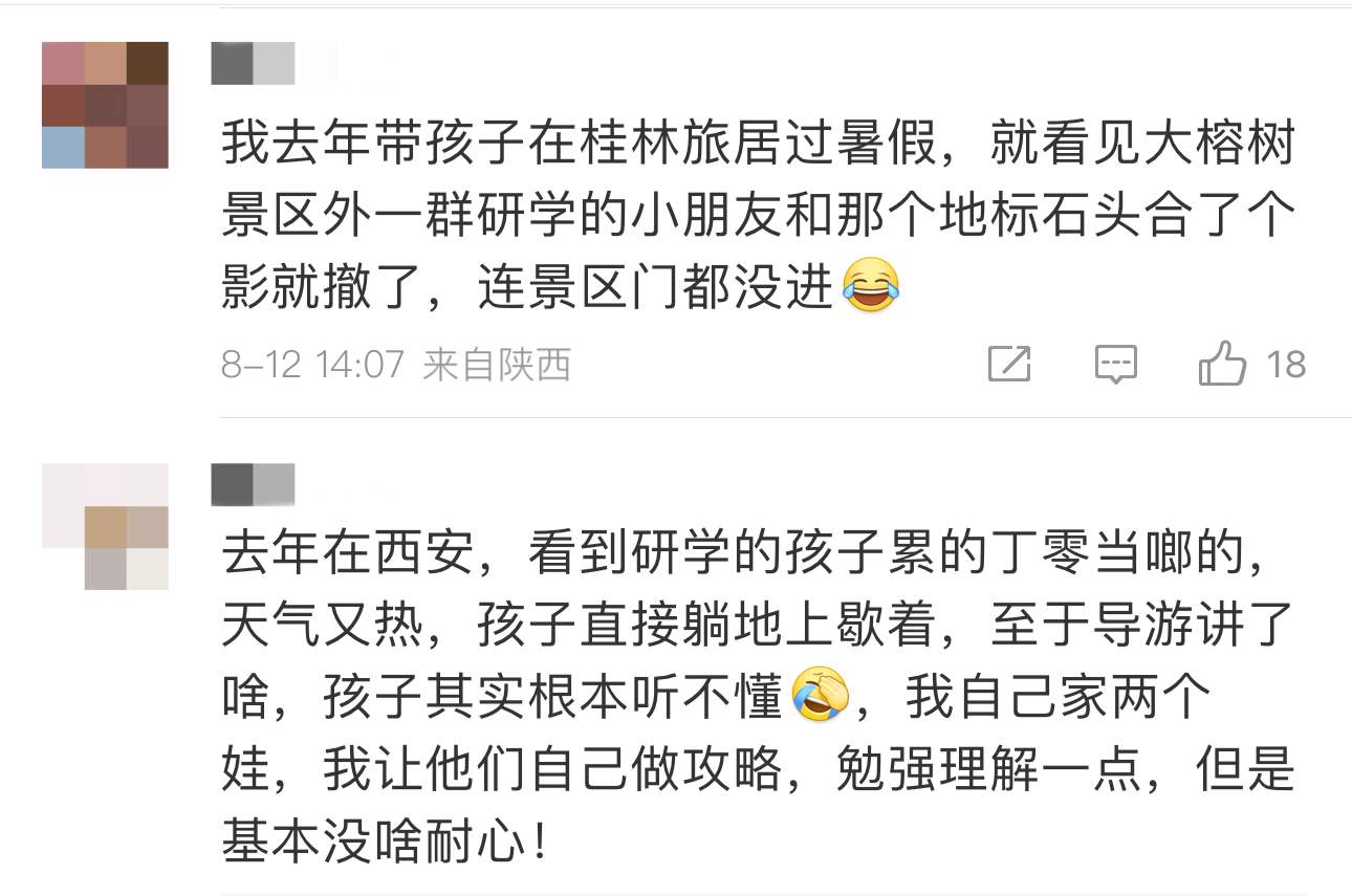 有网友表示:“我去年带孩子在桂林旅居过暑假,就看见大榕树景区外一群研学的小朋友和那个地标石头合了个影就撤了,连景区门都没进。”