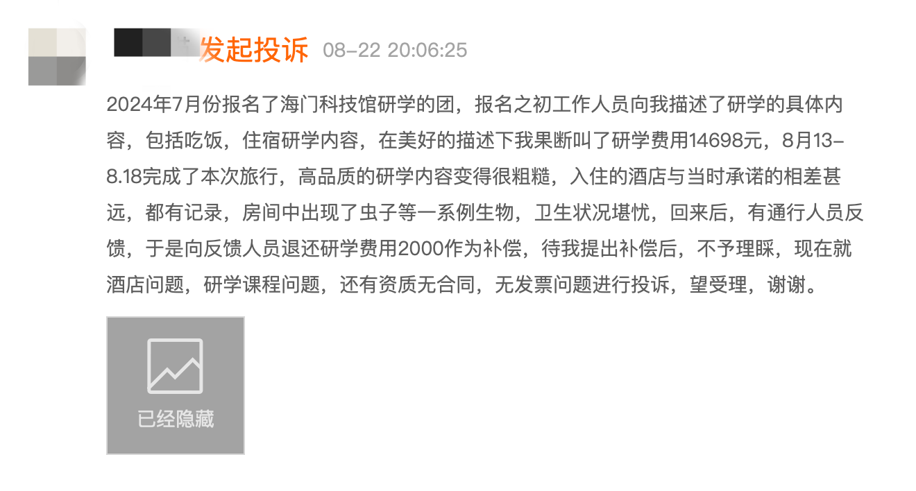 8月22日,有用户在投诉平台发起投诉称,7月花费14698元报名的研学团已经结束,但“高品质的研学内容变得很粗糙,入住的酒店与当时承诺的相差甚远,房间中出现了虫子等一系列生物,卫生状况堪忧……”该用户表示,回来后向反馈人员提出退还研学费用2000作为补偿,“待我提出补偿后,不予理睬,现在就酒店问题,研学课程问题,还有资质无合同、无发票问题进行投诉,望受理,谢谢。”