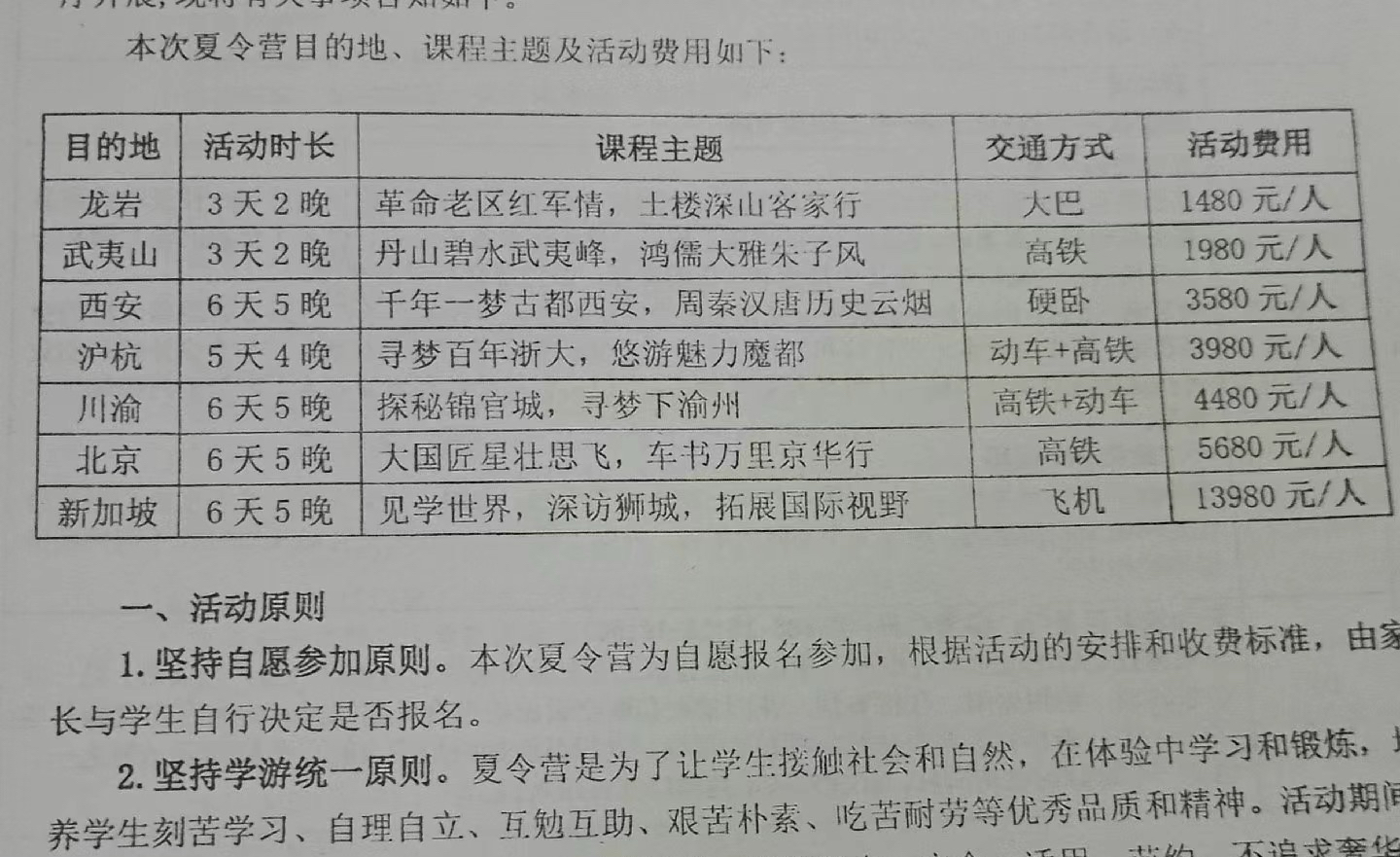 有在读学生晒出自己学校组织的暑期夏令营的价格表显示,3天2晚的活动价格皆在人均2000元以内;4晚以上的产品价格在3580元/人至5680元/人不等;6天5晚的新加坡夏令营价格为13980元/人。