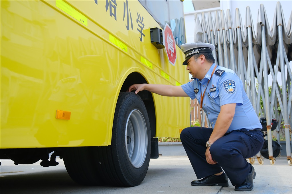 现场,两位来自支队车辆管理宣传大队的民警逐一对每辆校车外观、标牌、轮胎以及车上配备的药箱、灭火器、破窗锤等安全设施进行仔细检查。