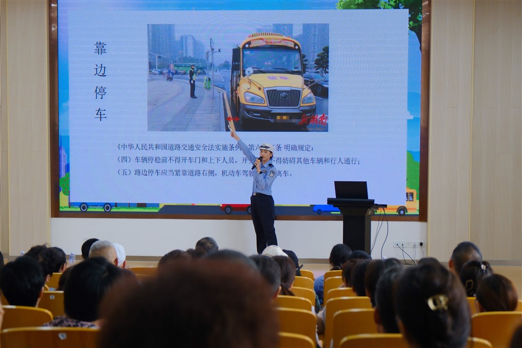 图说:来自东方明珠女警中队的民警顾逸玮对校车驾驶员、随车照管员上了“开学安全第一课”,就校车行车安全、行车规范及注意事项进行科普及重点提示