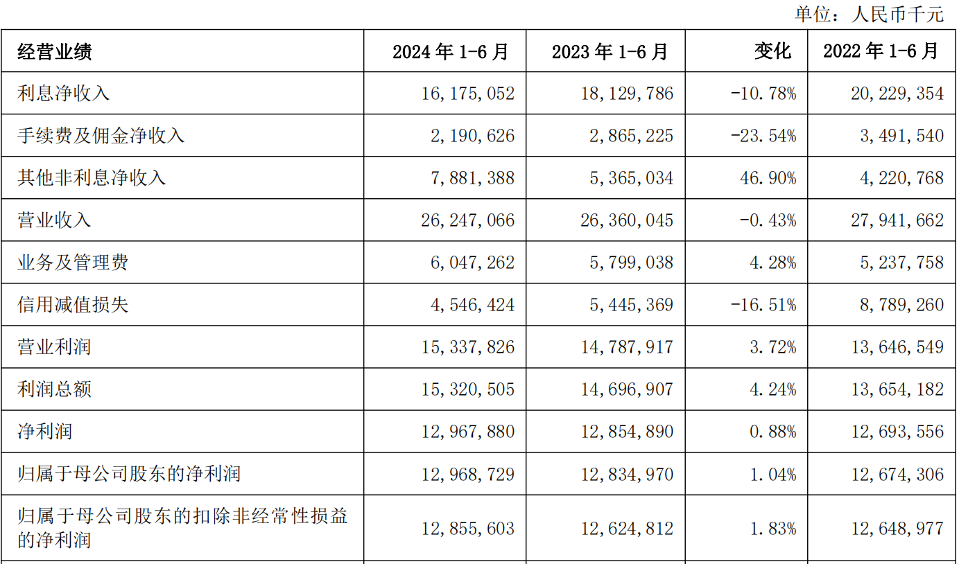 上海银行2024年上半年经营业绩 来源:上海银行半年报