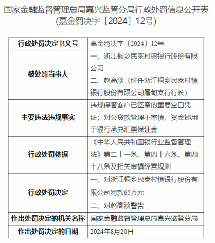 因违规保管重要空白凭证等,浙江桐乡民泰村镇银行被罚65万元
