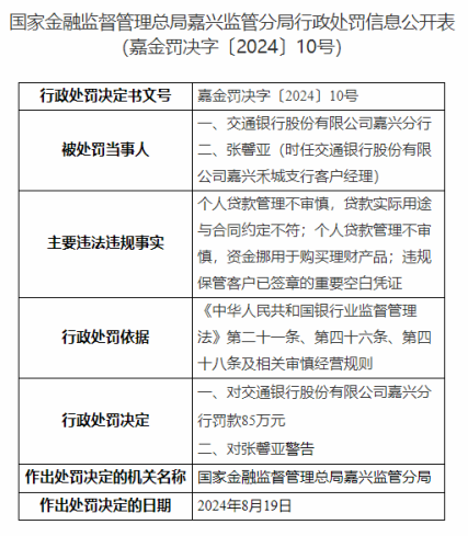 因贷款用途与合同约定不符等,交通银行嘉兴分行被罚85万元