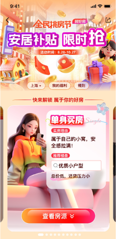 为帮助购房者提高找房效率,活动精心设置了“找房区”与“优惠区”两大核心板块,旨在通过精准导航,让购房者轻松锁定心仪房源。在“找房区”,先进的AI技术与大数据分析能力并肩作战,根据购房者的不同置业需求(如单身、新婚、教育、改善、工作等),量身打造个性化选房方案,让找房之路更加便捷高效。而“优惠区”则集中展示各类限时优惠信息,确保每位购房者都能不错过任何一次省钱良机。