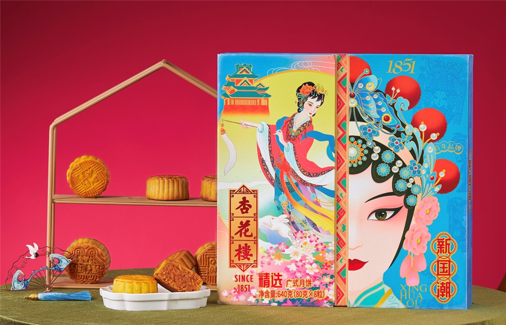 ▲ 杏花楼推出“新国潮”月饼礼盒包装,将品牌经典人物画嫦娥与京剧脸谱相融。霍万春|摄
