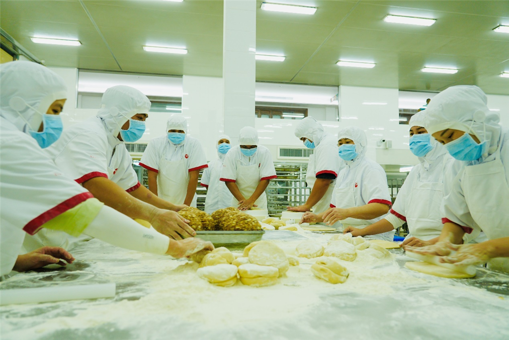24小时内,榴莲冰皮、拔丝流心、双黄纯白莲蓉等百万个不同口味的月饼都在这里诞生,再通过电商平台销往全国。高峰期,华美食品日产月饼可以达到350万个。