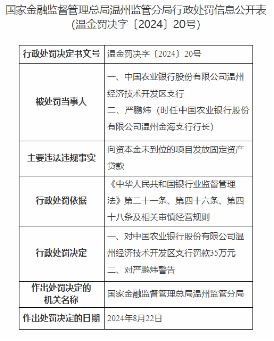 因向资本金未到位项目发放贷款,农业银行温州经开区支行被罚35