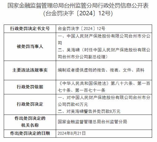 因编制或提供虚假报表等,中国人保财险台州分公司被罚40万元